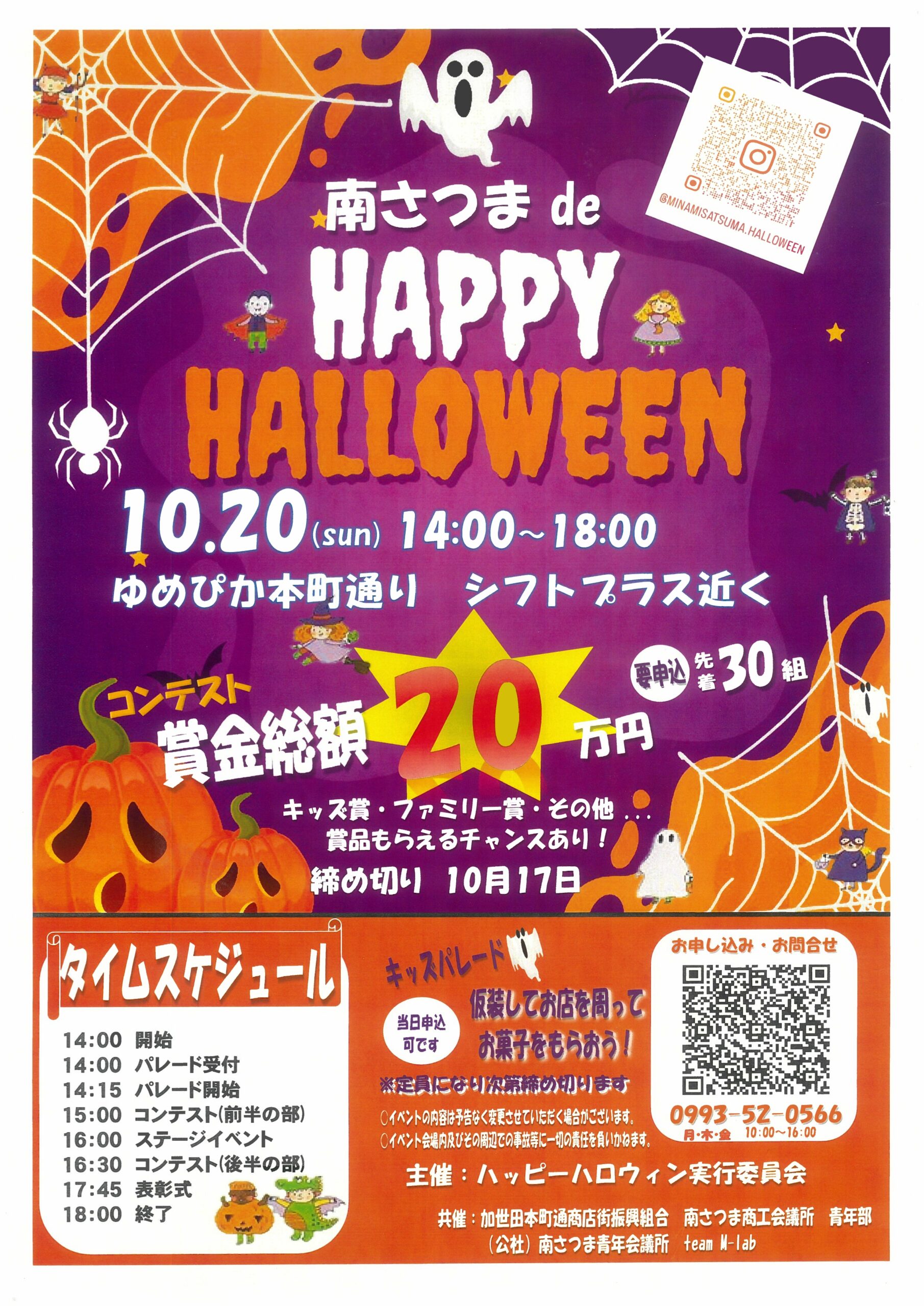 2024年10月3日 / 最終更新日 : 2025年2月20日 info 地域のお知らせ ハロウィンイベントのご案内 🎃南さつま de HAPPY HALLOWEEN🎃 ● 日 時 2024年10月20日(日曜日) 14:00~18:00 ● 場 所 ゆめぴか本町通り キッズパレードや仮装コンテストなど、お子様やご家族でお楽しみ頂けるイベントとなっております。 Facebooktwitter