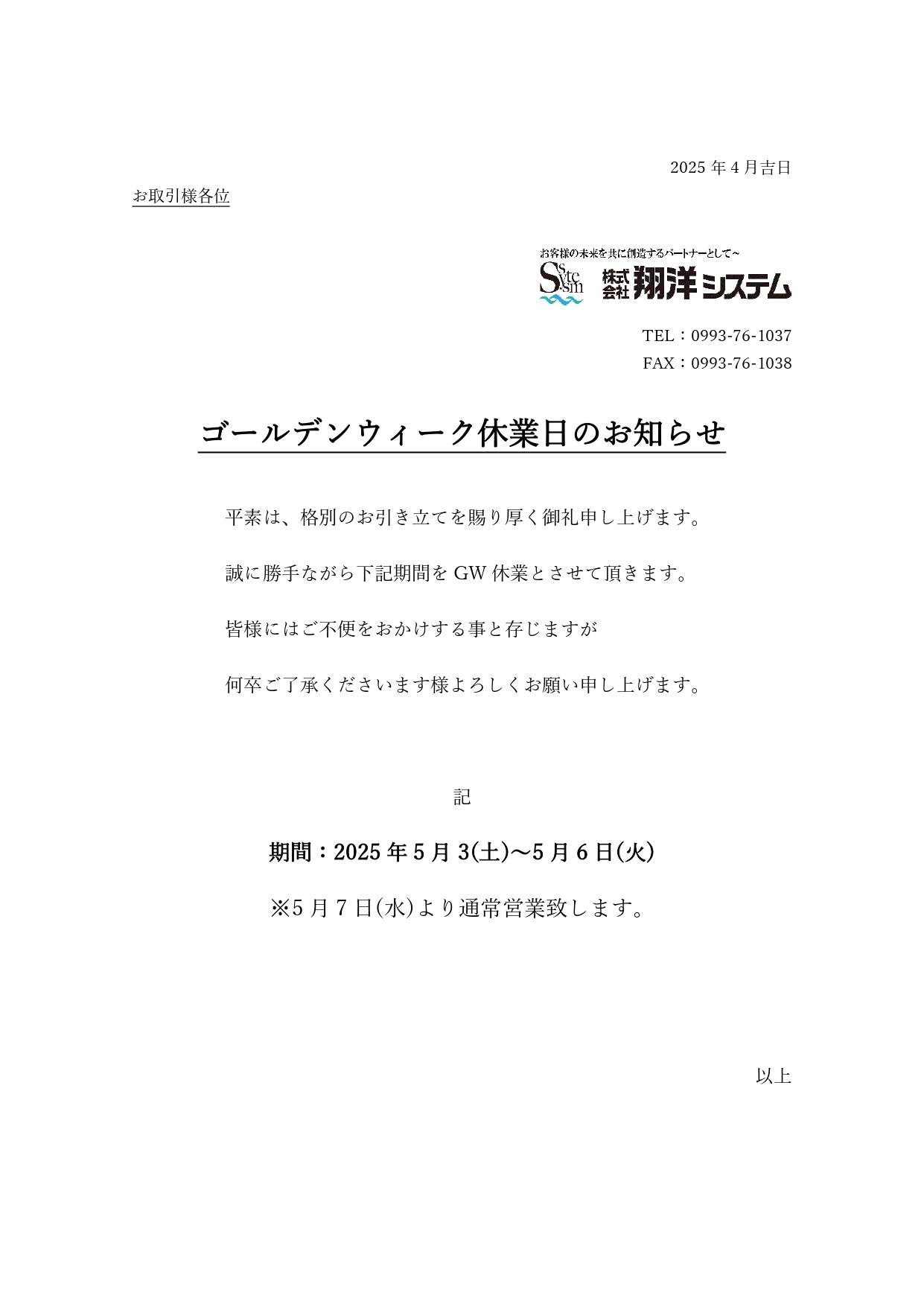 2025年ゴールデンウィークの休業ご案内