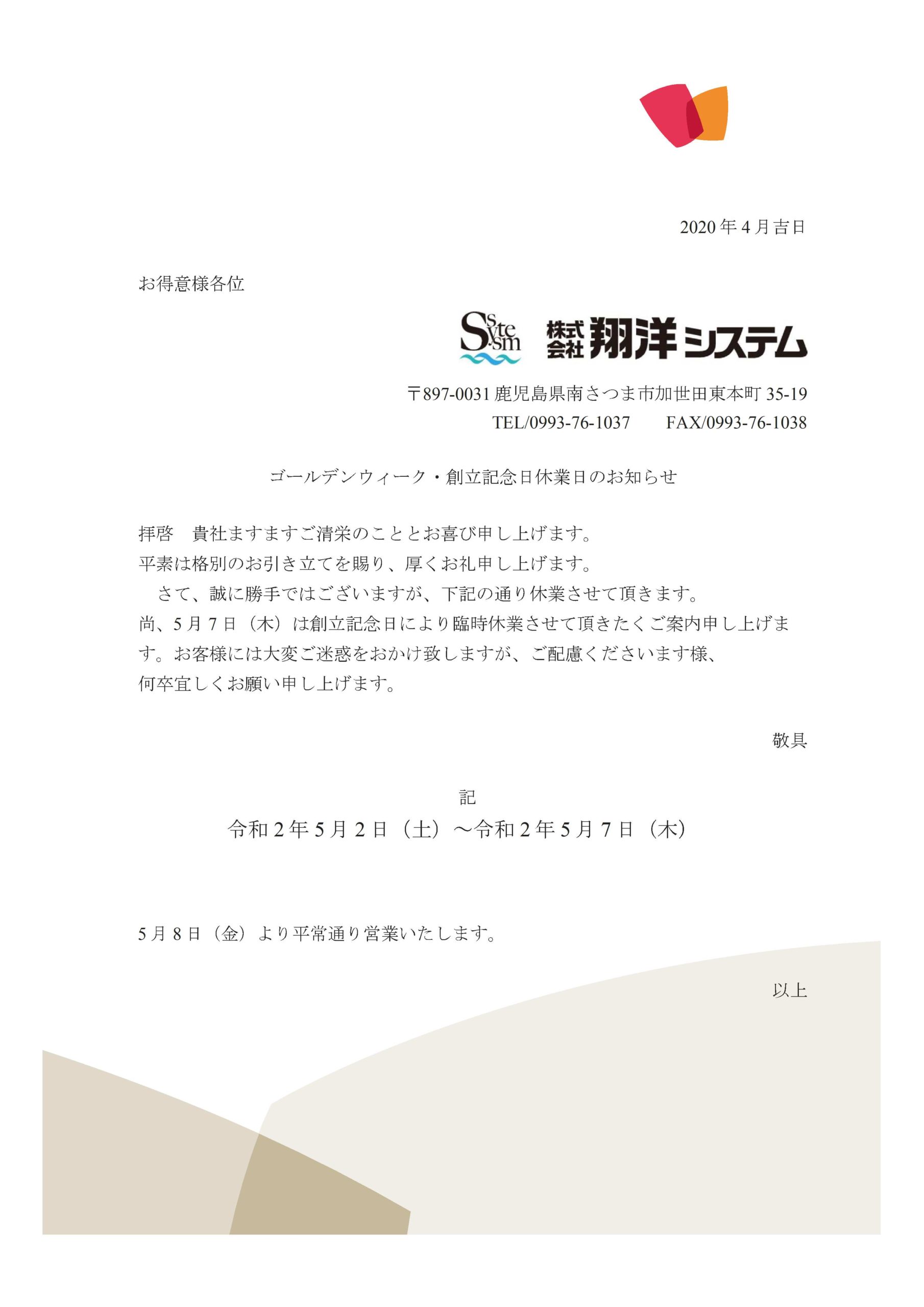 ゴールデンウィークの休業期間のお知らせ