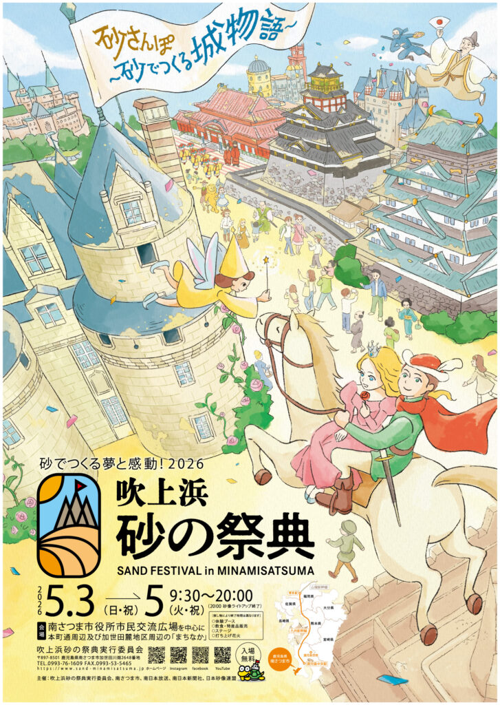 2026年2月25日 / 最終更新日 : 2026年2月25日 s.matsumoto 地域のお知らせ 2026 吹上浜砂の祭典のご案内 今年も吹上浜砂の祭典の開催が決定しました! 砂像テーマは『砂さんぽ~砂でつくる城物語~』です! 砂像だけでなく、その他楽しいイベントもありますので近くに寄られた際はぜひお立ち寄りください。 ● 日 程 2026年5月3日(日)~5月5日(火)の3日間 ● 会 場 南さつま市役所市民交流広場を中心に本町通り周辺及び加世田麓地区周辺の「まちなか」 お客様の未来を共に想像するパートナーとして~ 株式会社翔洋システム Facebooktwitter